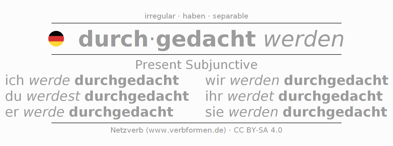 The verb durch-denken fully conjugated in all persons and numbers in the Subjunctive Present