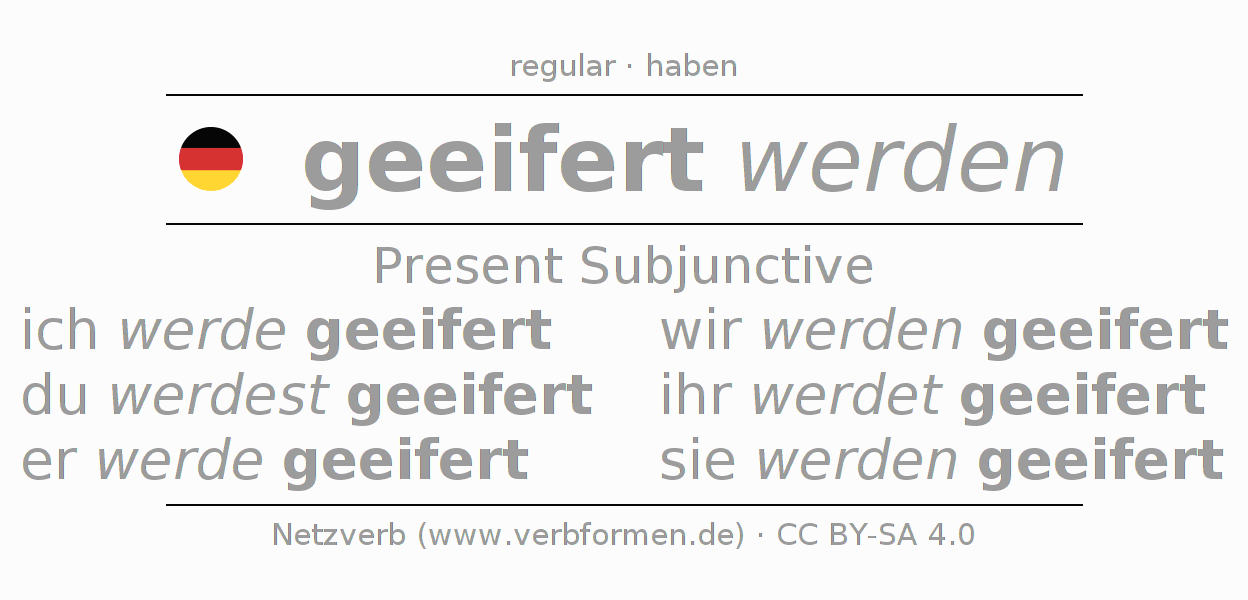 The conjugation of eifern in Subjunctive Present Form of possibility Passive is ich werde geeifert, du werdest geeifert, er werde geeifert, wir werden geeifert, ihr werdet geeifert, sie werden geeifert.The conjugation corresponds to certain grammatical rules. Likewise the requirements for the conjugation of the simple verb forms of eifern in Present Subjunctive. Comments ☆
