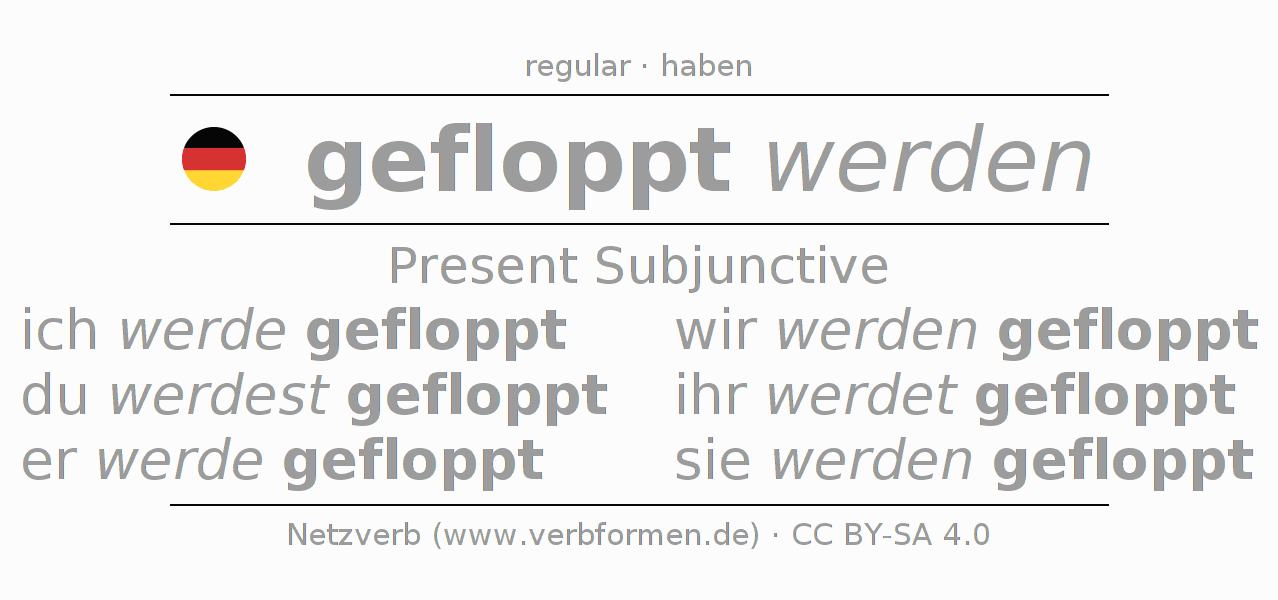 The conjugation of floppen in Subjunctive Present Form of possibility Passive is ich werde gefloppt, du werdest gefloppt, er werde gefloppt, wir werden gefloppt, ihr werdet gefloppt, sie werden gefloppt.The conjugation corresponds to certain grammatical rules. Likewise the requirements for the conjugation of the simple verb forms of floppen in Present Subjunctive. Comments ☆