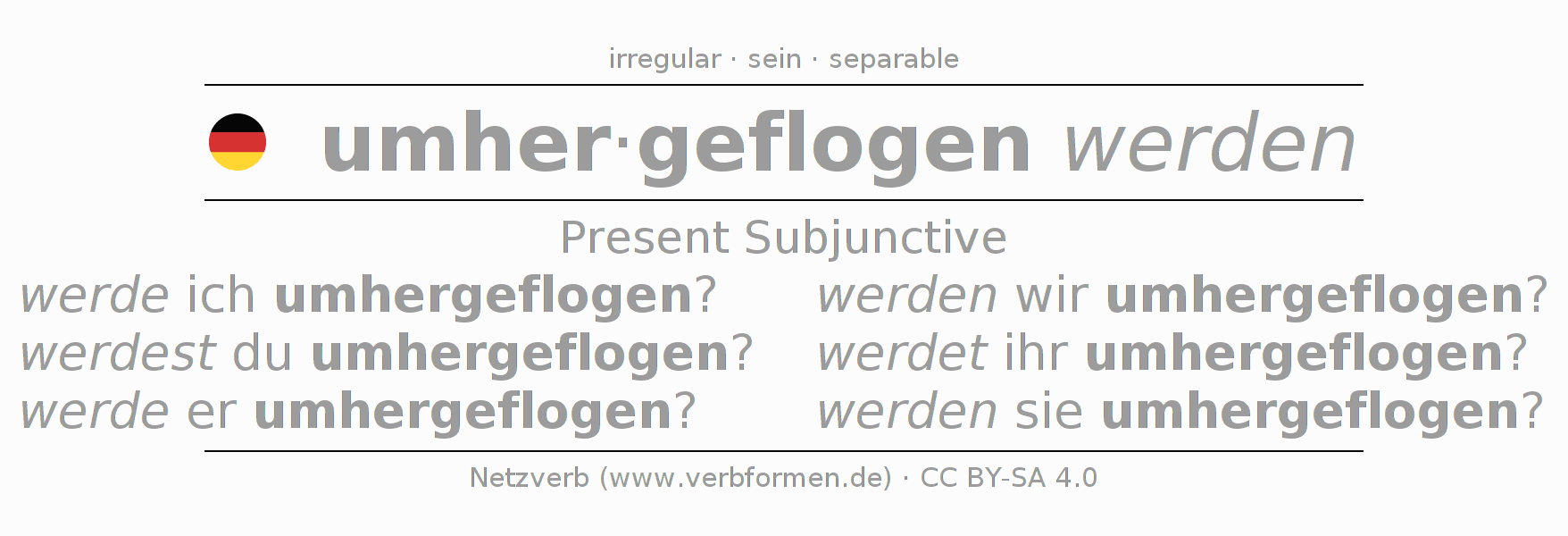 The conjugation of umherfliegen in Subjunctive Present Form of possibility Passive is werde ich umhergeflogen?, werdest du umhergeflogen?, werde er umhergeflogen?, werden wir umhergeflogen?, werdet ihr umhergeflogen?, werden sie umhergeflogen?.The conjugation corresponds to certain grammatical rules. Likewise the requirements for the conjugation of the simple verb forms of umherfliegen in Present Subjunctive. Comments ☆