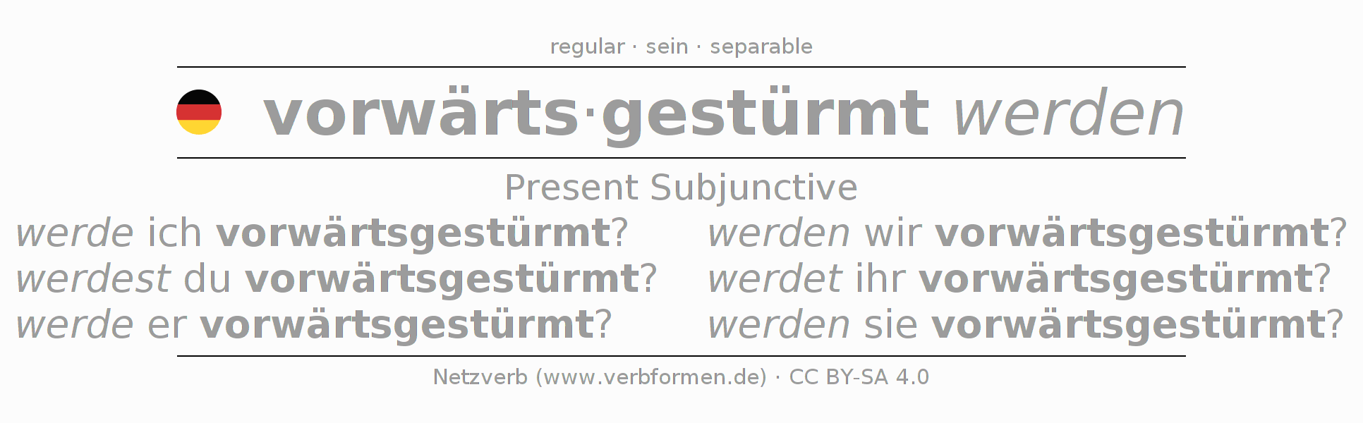 The conjugation of vorwärtsstürmen in Subjunctive Present Form of possibility Passive is werde ich vorwärtsgestürmt?, werdest du vorwärtsgestürmt?, werde er vorwärtsgestürmt?, werden wir vorwärtsgestürmt?, werdet ihr vorwärtsgestürmt?, werden sie vorwärtsgestürmt?.The conjugation corresponds to certain grammatical rules. Likewise the requirements for the conjugation of the simple verb forms of vorwärtsstürmen in Present Subjunctive. Comments ☆