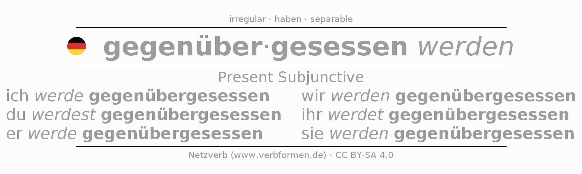 The verb gegenübersitzen (hat) fully conjugated in all persons and numbers in the Subjunctive Present