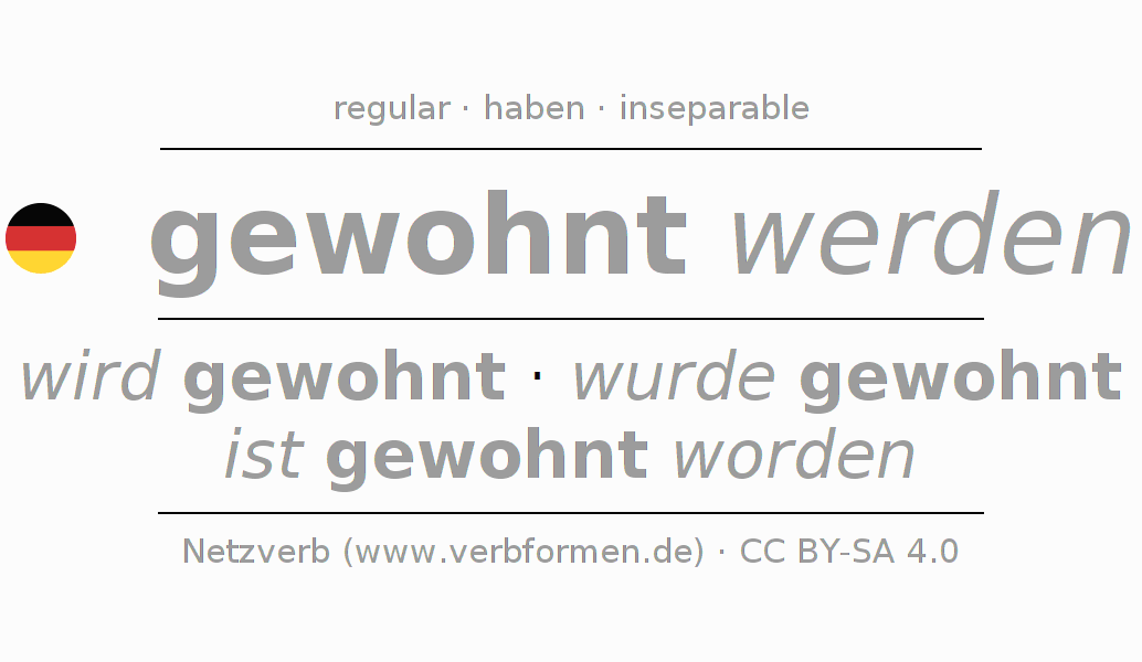 The conjugation of gewohnen in Subjunctive Present Form of possibility Passive is ich werde gewohnt, du werdest gewohnt, er werde gewohnt, wir werden gewohnt, ihr werdet gewohnt, sie werden gewohnt.The conjugation corresponds to certain grammatical rules. Likewise the requirements for the conjugation of the simple verb forms of gewohnen in Present Subjunctive. Comments ☆