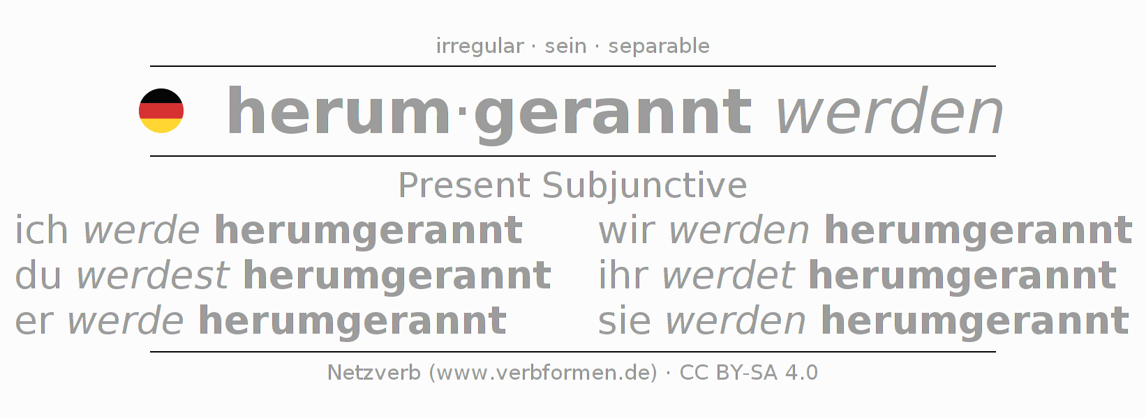 The conjugation of herumrennen in Subjunctive Present Form of possibility Passive is ich werde herumgerannt, du werdest herumgerannt, er werde herumgerannt, wir werden herumgerannt, ihr werdet herumgerannt, sie werden herumgerannt.The conjugation corresponds to certain grammatical rules. Likewise the requirements for the conjugation of the simple verb forms of herumrennen in Present Subjunctive. Comments ☆