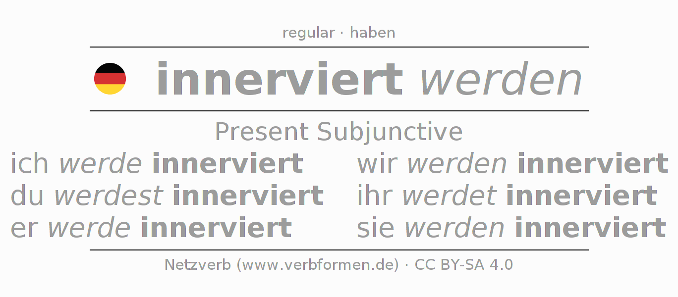 The conjugation of innervieren in Subjunctive Present Form of possibility Passive is ich werde innerviert, du werdest innerviert, er werde innerviert, wir werden innerviert, ihr werdet innerviert, sie werden innerviert.The conjugation corresponds to certain grammatical rules. Likewise the requirements for the conjugation of the simple verb forms of innervieren in Present Subjunctive. Comments ☆
