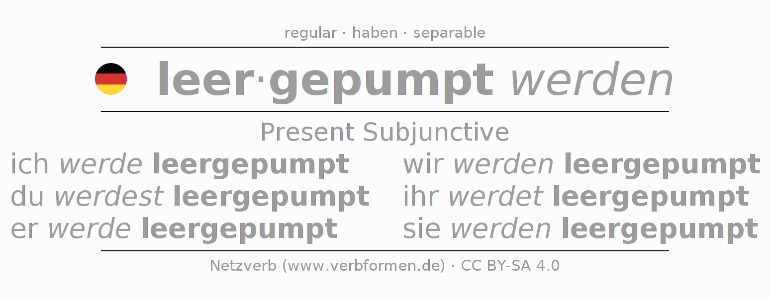 The conjugation of leerpumpen in Subjunctive Present Form of possibility Passive is ich werde leergepumpt, du werdest leergepumpt, er werde leergepumpt, wir werden leergepumpt, ihr werdet leergepumpt, sie werden leergepumpt.The conjugation corresponds to certain grammatical rules. Likewise the requirements for the conjugation of the simple verb forms of leerpumpen in Present Subjunctive. Comments ☆