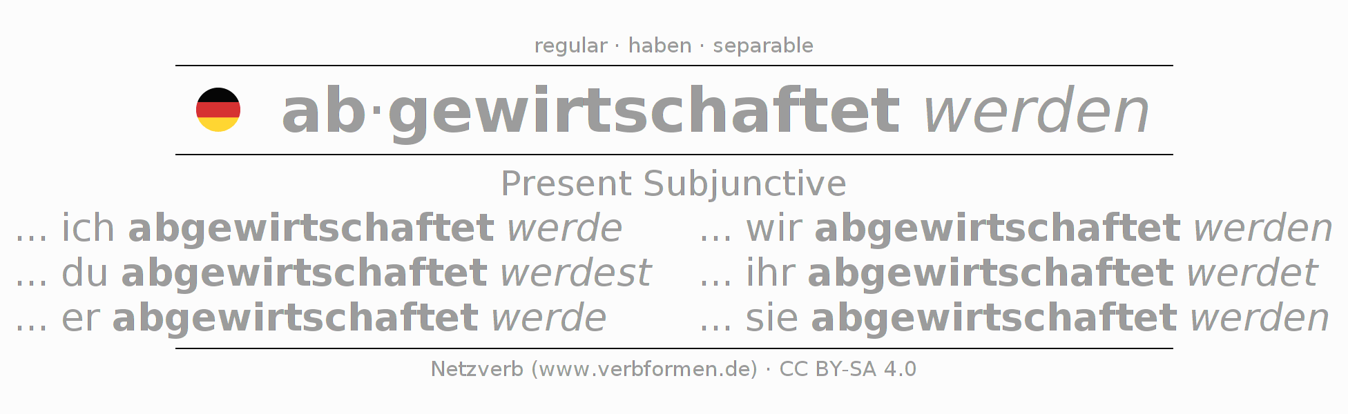 The verb abwirtschaften fully conjugated in all persons and numbers in the Subjunctive Present