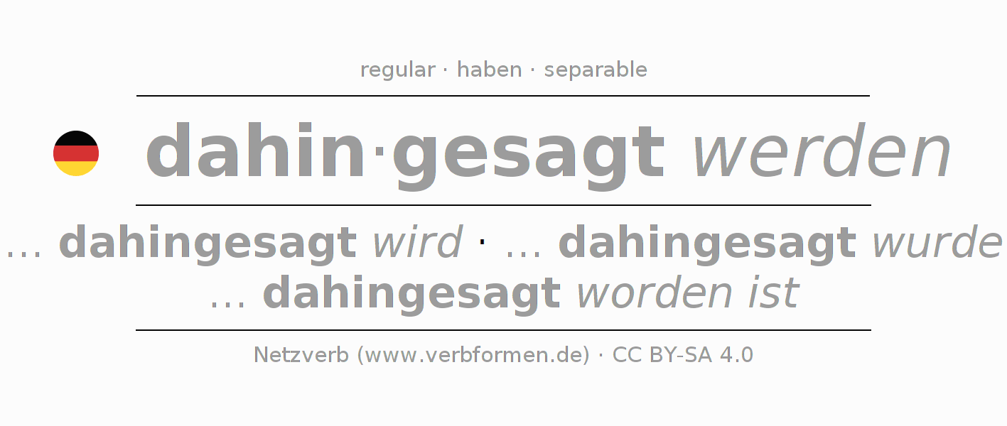 The conjugation of dahinsagen in Subjunctive Present Form of possibility Passive is ... ich dahingesagt werde, ... du dahingesagt werdest, ... er dahingesagt werde, ... wir dahingesagt werden, ... ihr dahingesagt werdet, ... sie dahingesagt werden.The conjugation corresponds to certain grammatical rules. Likewise the requirements for the conjugation of the simple verb forms of dahinsagen in Present Subjunctive. Comments ☆