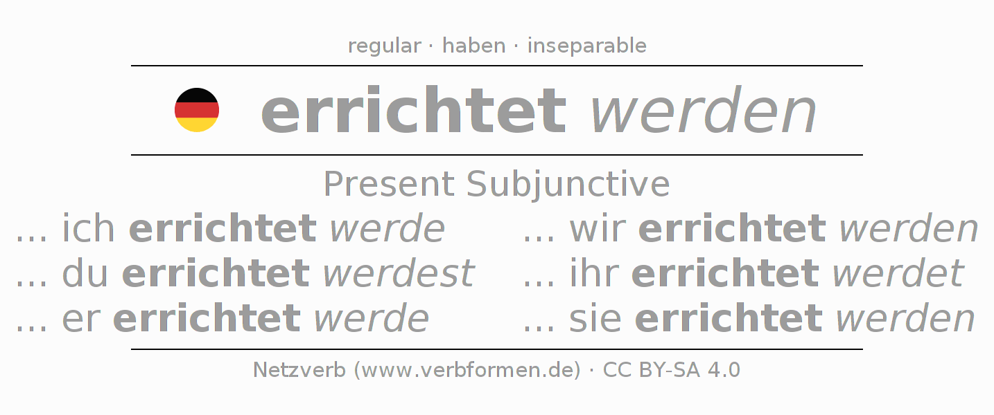 The conjugation of errichten in Subjunctive Present Form of possibility Passive is ... ich errichtet werde, ... du errichtet werdest, ... er errichtet werde, ... wir errichtet werden, ... ihr errichtet werdet, ... sie errichtet werden.The conjugation corresponds to certain grammatical rules. Likewise the requirements for the conjugation of the simple verb forms of errichten in Present Subjunctive. Comments ☆
