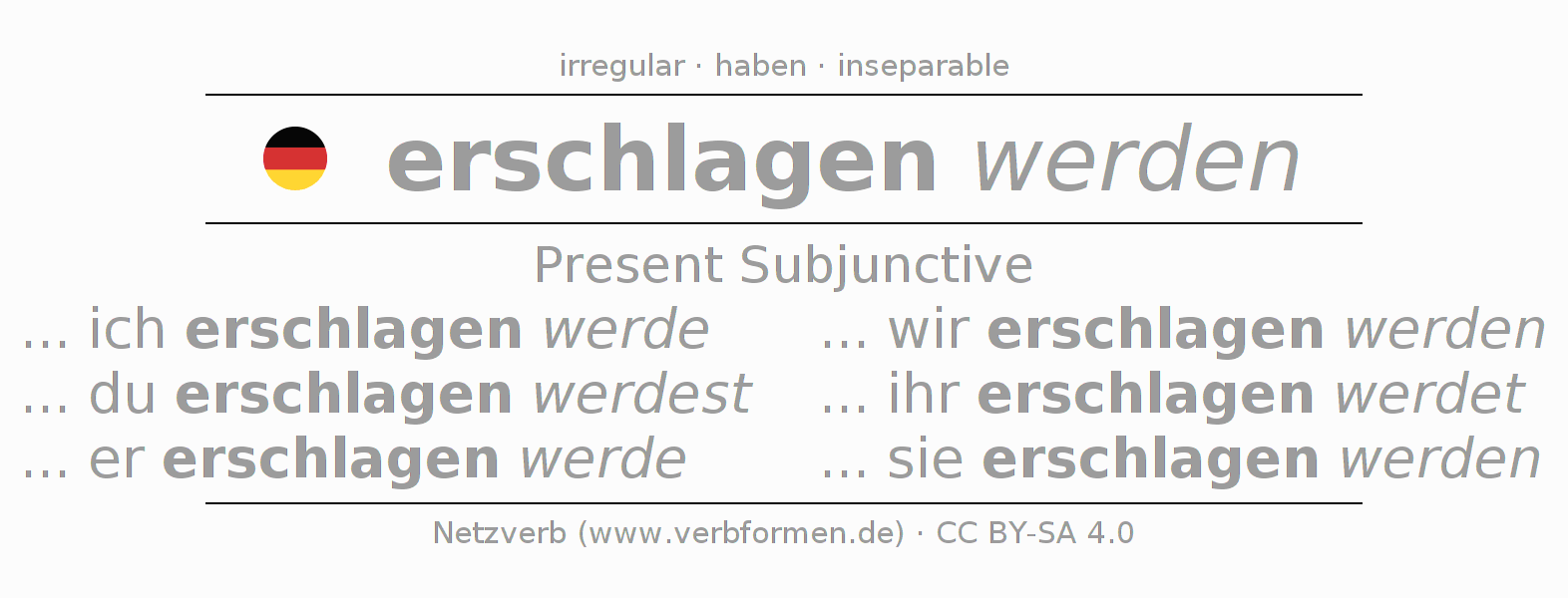The conjugation of erschlagen in Subjunctive Present Form of possibility Passive is ... ich erschlagen werde, ... du erschlagen werdest, ... er erschlagen werde, ... wir erschlagen werden, ... ihr erschlagen werdet, ... sie erschlagen werden.The conjugation corresponds to certain grammatical rules. Likewise the requirements for the conjugation of the simple verb forms of erschlagen in Present Subjunctive. Comments ☆