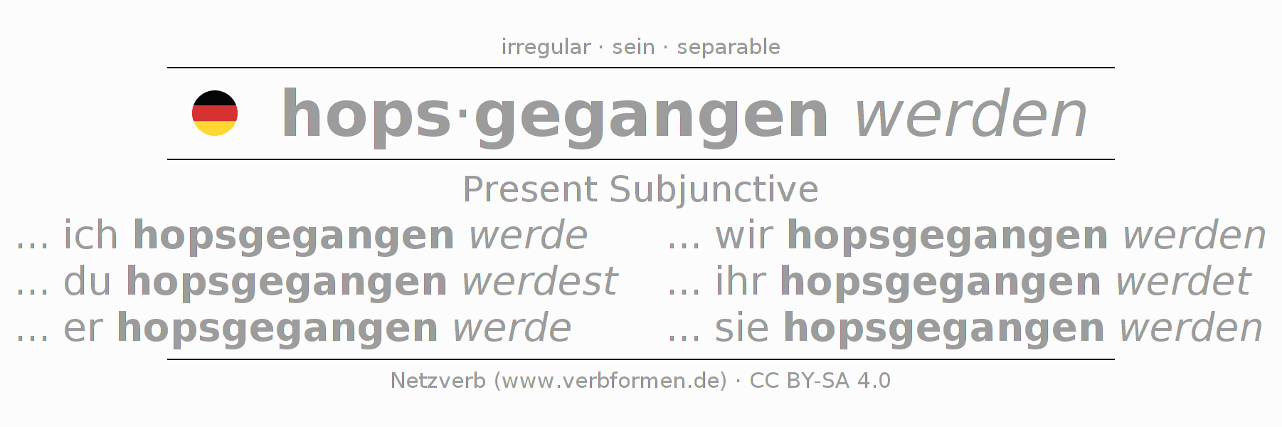 The verb hopsgehen fully conjugated in all persons and numbers in the Subjunctive Present