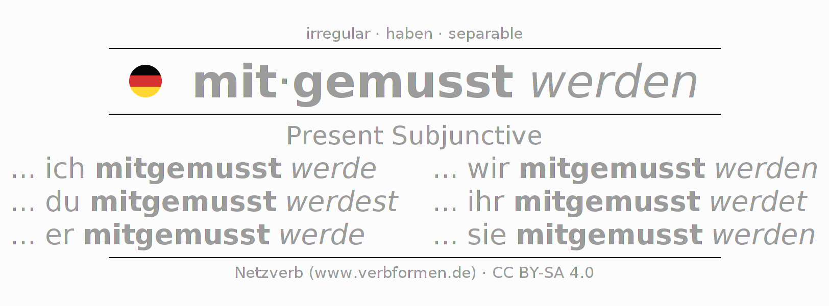 The conjugation of mitmüssen in Subjunctive Present Form of possibility Passive is ... ich mitgemusst werde, ... du mitgemusst werdest, ... er mitgemusst werde, ... wir mitgemusst werden, ... ihr mitgemusst werdet, ... sie mitgemusst werden.The conjugation corresponds to certain grammatical rules. Likewise the requirements for the conjugation of the simple verb forms of mitmüssen in Present Subjunctive. Comments ☆