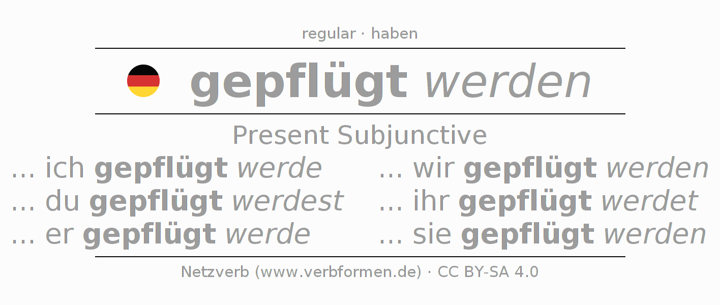 The conjugation of pflügen in Subjunctive Present Form of possibility Passive is ... ich gepflügt werde, ... du gepflügt werdest, ... er gepflügt werde, ... wir gepflügt werden, ... ihr gepflügt werdet, ... sie gepflügt werden.The conjugation corresponds to certain grammatical rules. Likewise the requirements for the conjugation of the simple verb forms of pflügen in Present Subjunctive. Comments ☆