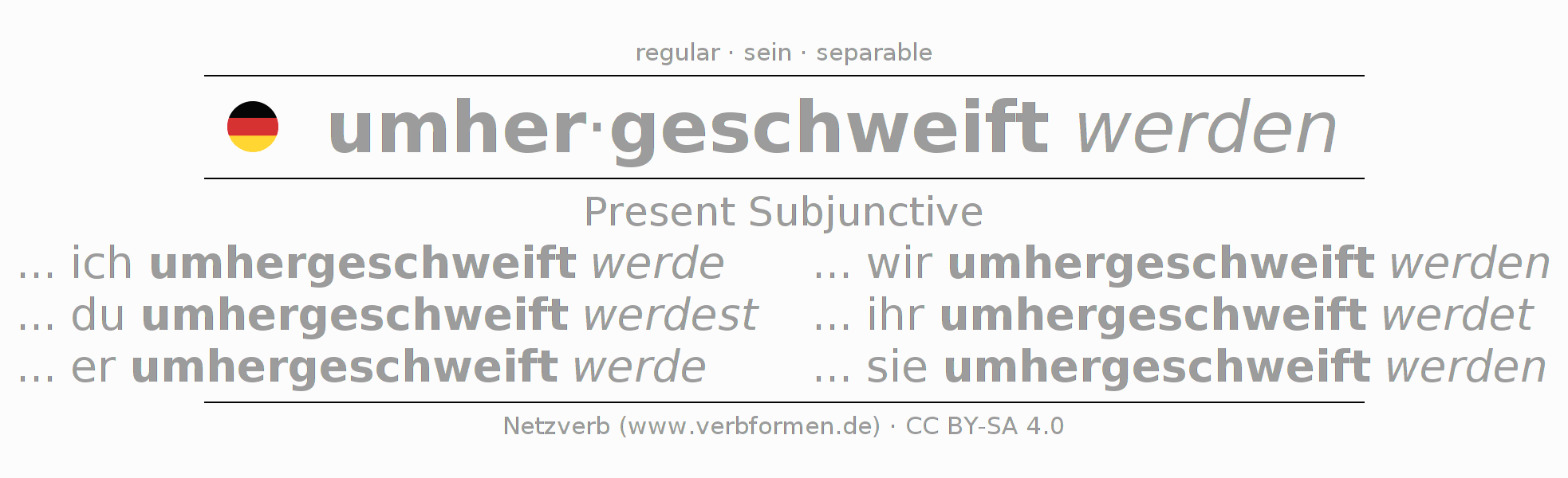 The verb umherschweifen fully conjugated in all persons and numbers in the Subjunctive Present