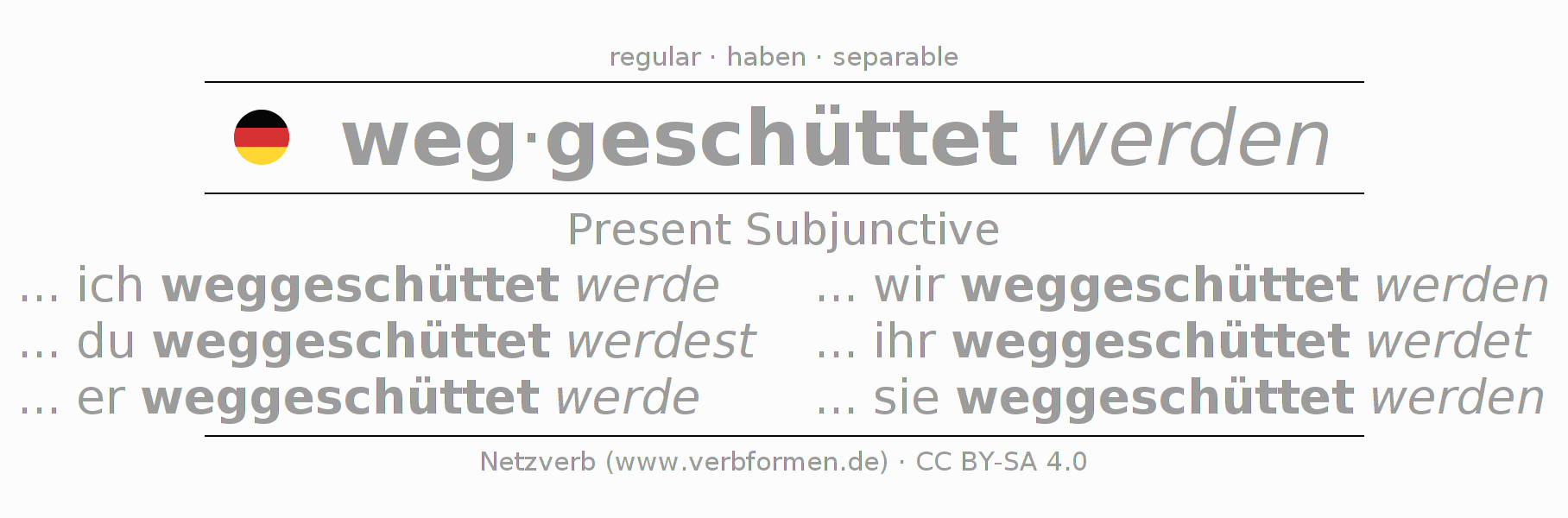 The verb wegschütten fully conjugated in all persons and numbers in the Subjunctive Present