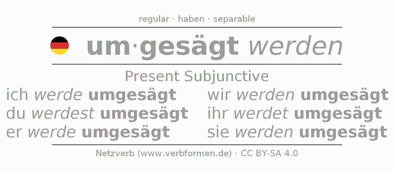 The conjugation of umsägen in Subjunctive Present Form of possibility Passive is ich werde umgesägt, du werdest umgesägt, er werde umgesägt, wir werden umgesägt, ihr werdet umgesägt, sie werden umgesägt.The conjugation corresponds to certain grammatical rules. Likewise the requirements for the conjugation of the simple verb forms of umsägen in Present Subjunctive. Comments ☆