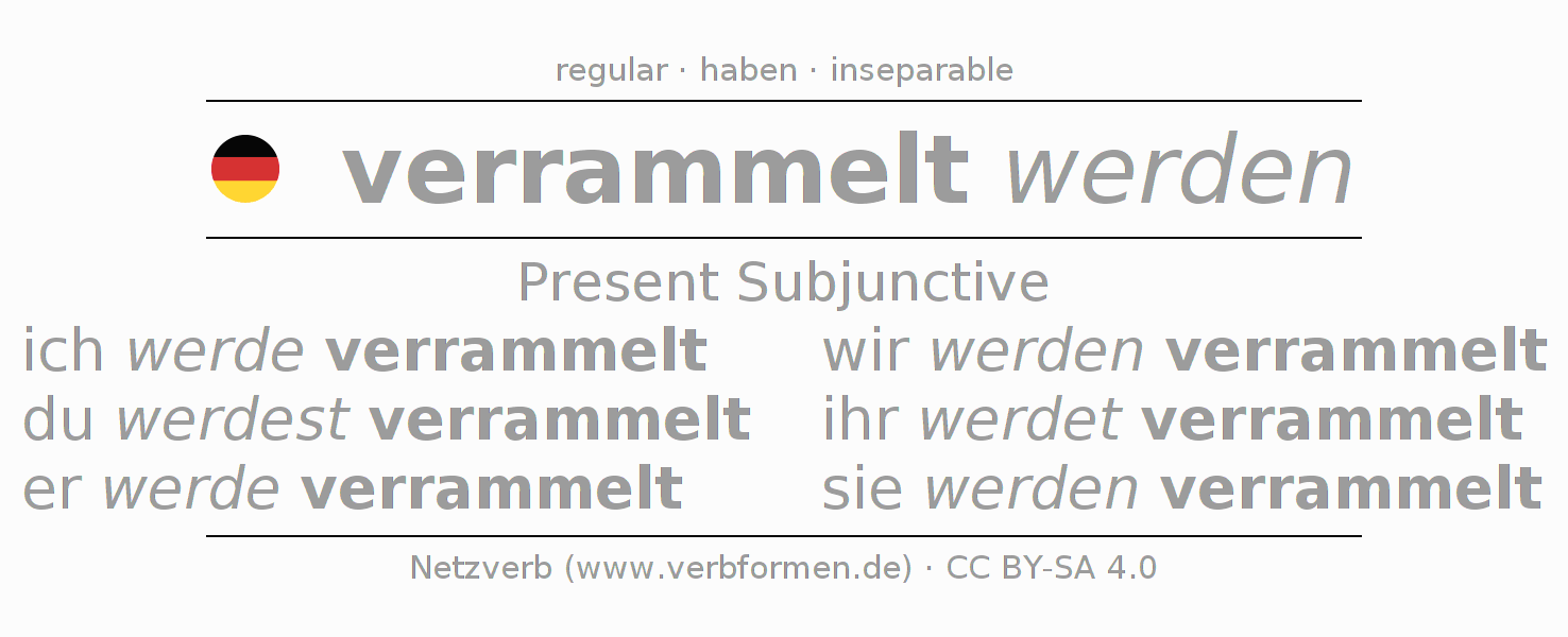 The verb verrammeln fully conjugated in all persons and numbers in the Subjunctive Present