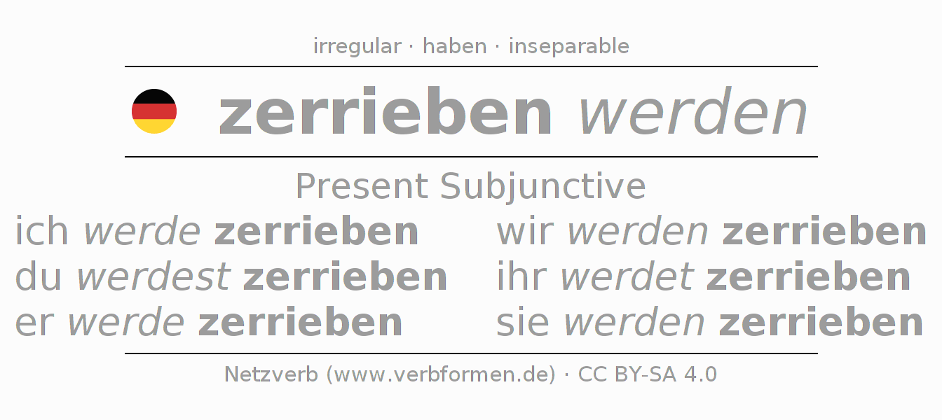 The verb zerreiben fully conjugated in all persons and numbers in the Subjunctive Present