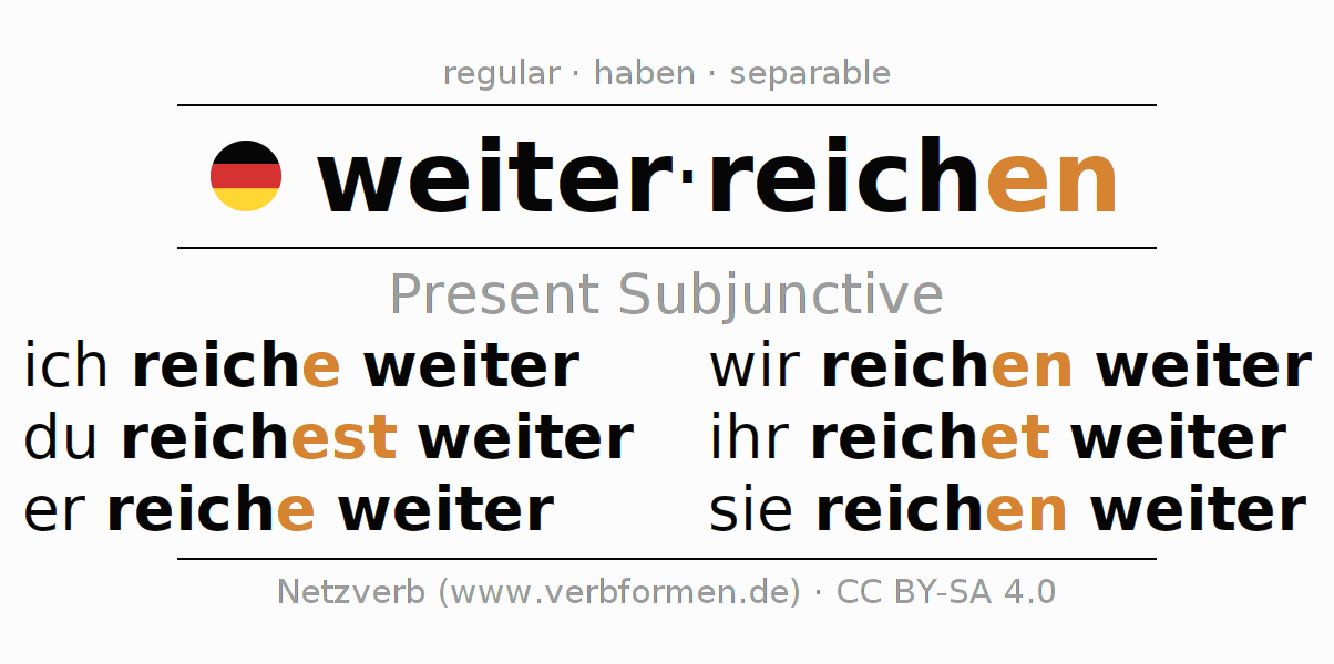 The verb weiterreichen fully conjugated in all persons and numbers in the Subjunctive Present