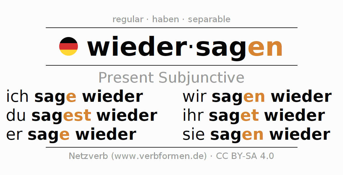 The conjugation of wiedersagen (inform, relay) in subjunctive I is: ich sage wieder, du sagest wieder, er sage wieder, wir sagen wieder, ihr saget wieder, sie sagen wieder. The endings -e, -est, -e, -en, -et, -en are appended to the base or verb stem sag. The prefix wieder - of wiedersagen is separated. The conjugation of these forms conforms to the grammatical rules for verbs in the subjunctive I tense.