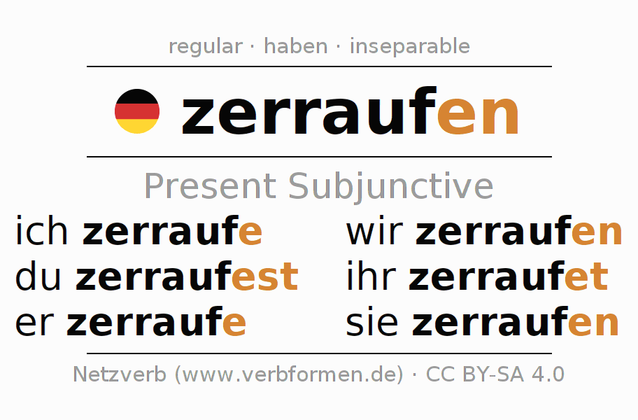 The verb zerraufen fully conjugated in all persons and numbers in the Subjunctive Present