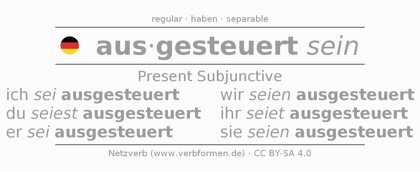 The verb aussteuern fully conjugated in all persons and numbers in the Subjunctive Present