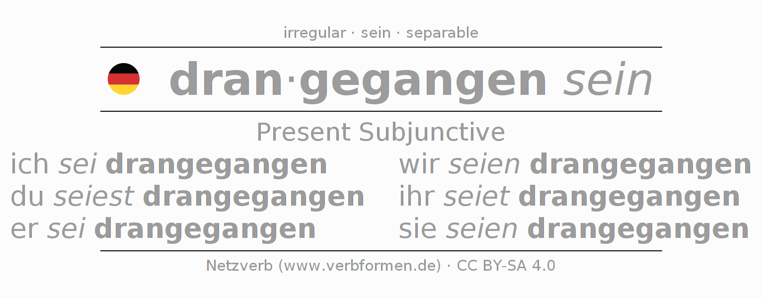 The conjugation of drangehen in Subjunctive Present Form of possibility Statal Passive is ich sei drangegangen, du seiest drangegangen, er sei drangegangen, wir seien drangegangen, ihr seiet drangegangen, sie seien drangegangen.The conjugation corresponds to certain grammatical rules. Likewise the requirements for the conjugation of the simple verb forms of drangehen in Present Subjunctive. Comments ☆