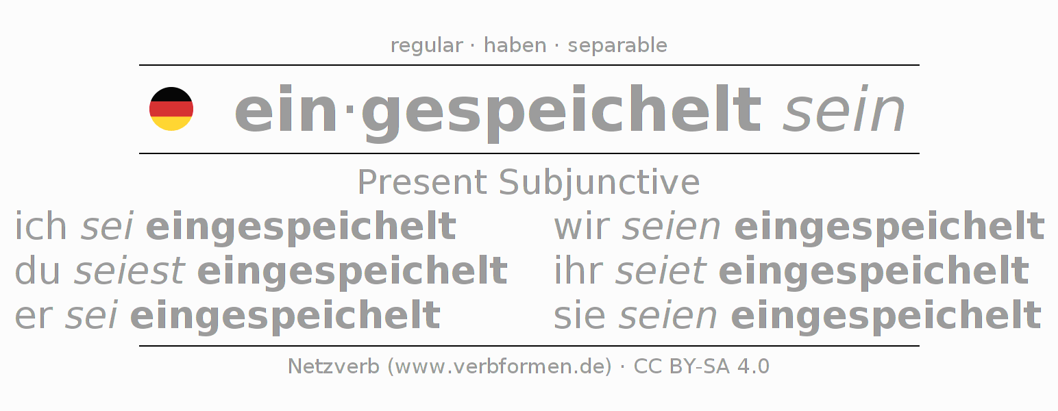 The verb einspeicheln fully conjugated in all persons and numbers in the Subjunctive Present