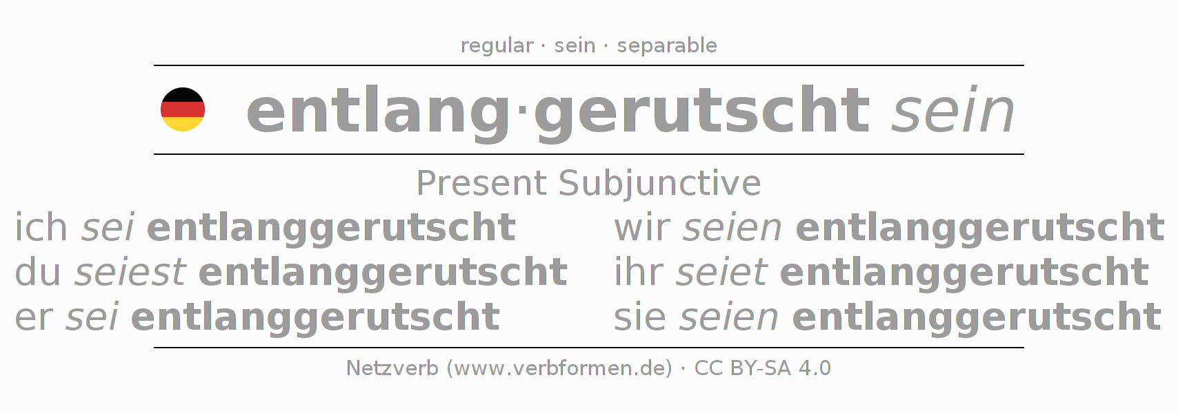 The verb entlangrutschen fully conjugated in all persons and numbers in the Subjunctive Present