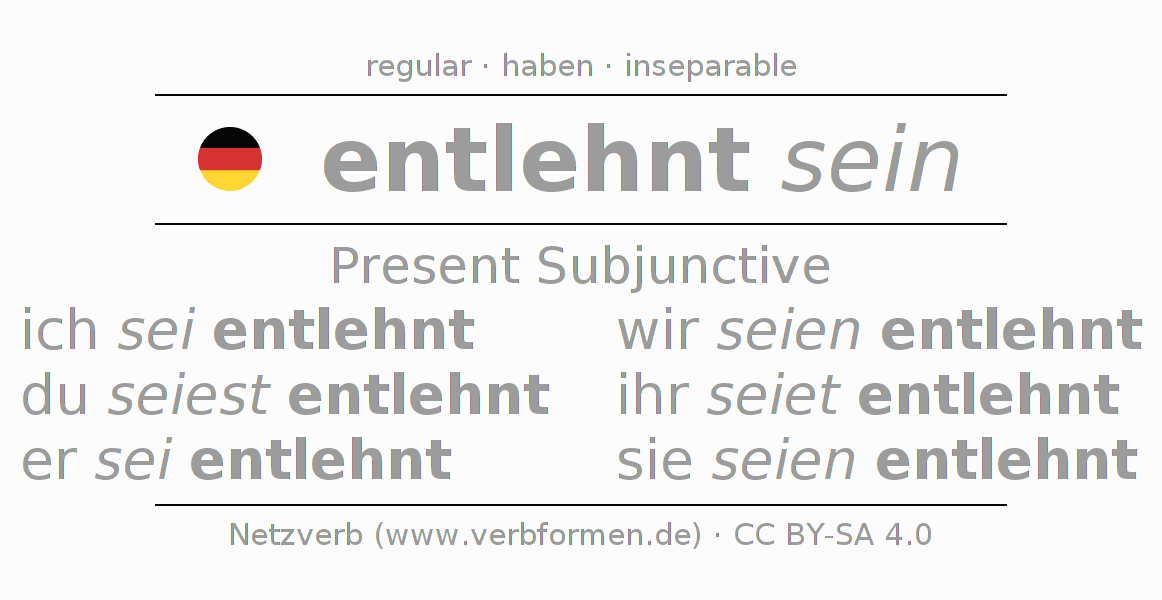 The conjugation of entlehnen in Subjunctive Present Form of possibility Statal Passive is ich sei entlehnt, du seiest entlehnt, er sei entlehnt, wir seien entlehnt, ihr seiet entlehnt, sie seien entlehnt.The conjugation corresponds to certain grammatical rules. Likewise the requirements for the conjugation of the simple verb forms of entlehnen in Present Subjunctive. Comments ☆