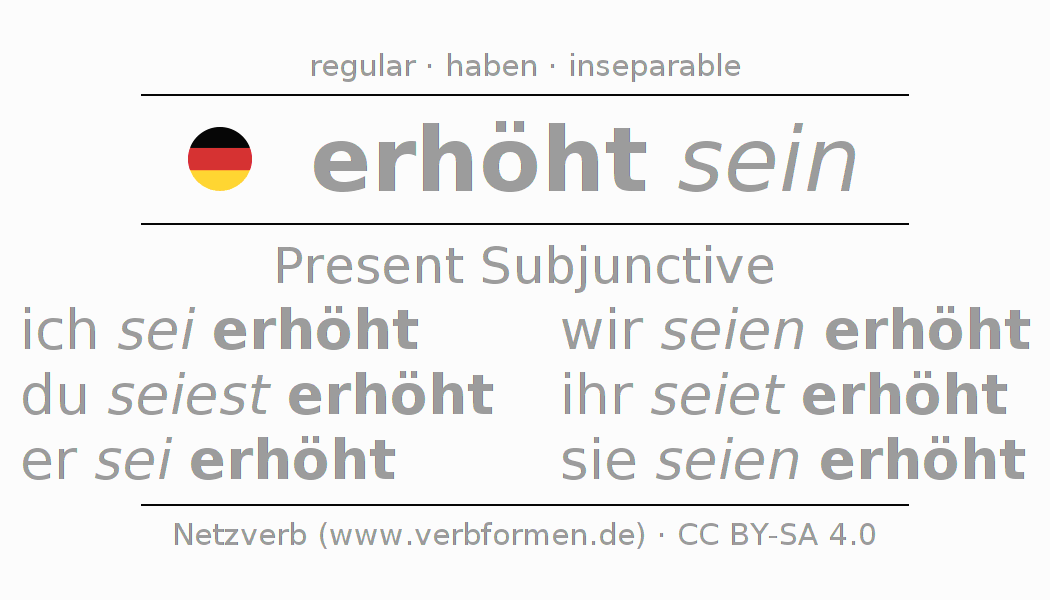 The conjugation of erhöhen in Subjunctive Present Form of possibility Statal Passive is ich sei erhöht, du seiest erhöht, er sei erhöht, wir seien erhöht, ihr seiet erhöht, sie seien erhöht.The conjugation corresponds to certain grammatical rules. Likewise the requirements for the conjugation of the simple verb forms of erhöhen in Present Subjunctive. Comments ☆