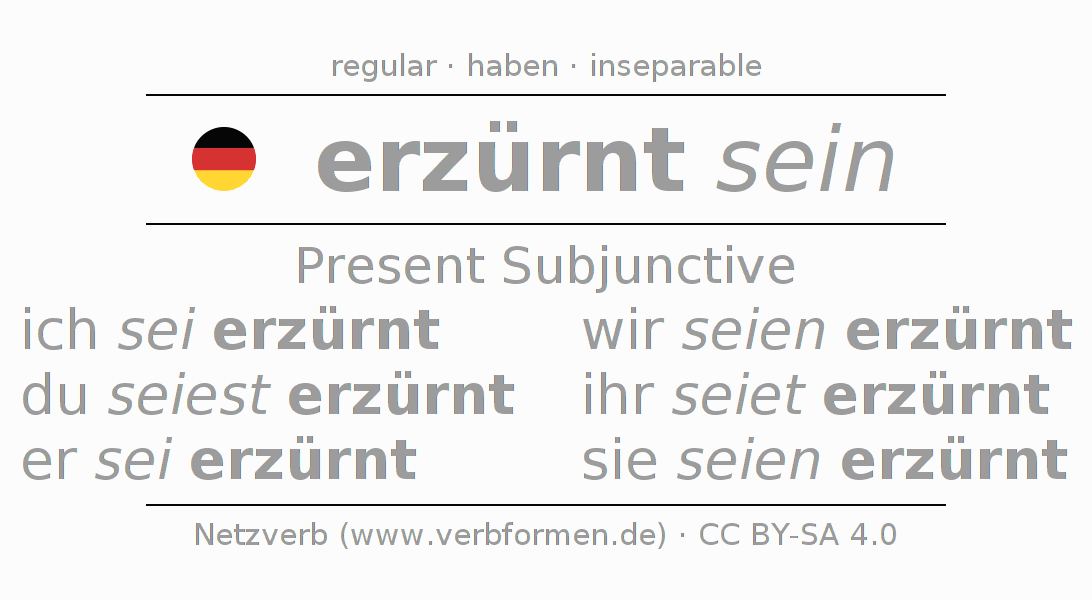 The verb erzürnen (hat) fully conjugated in all persons and numbers in the Subjunctive Present