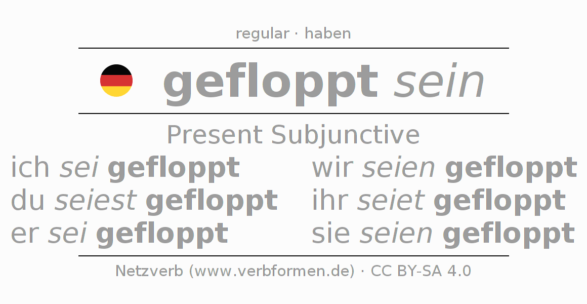 The conjugation of floppen in Subjunctive Present Form of possibility Statal Passive is ich sei gefloppt, du seiest gefloppt, er sei gefloppt, wir seien gefloppt, ihr seiet gefloppt, sie seien gefloppt.The conjugation corresponds to certain grammatical rules. Likewise the requirements for the conjugation of the simple verb forms of floppen in Present Subjunctive. Comments ☆