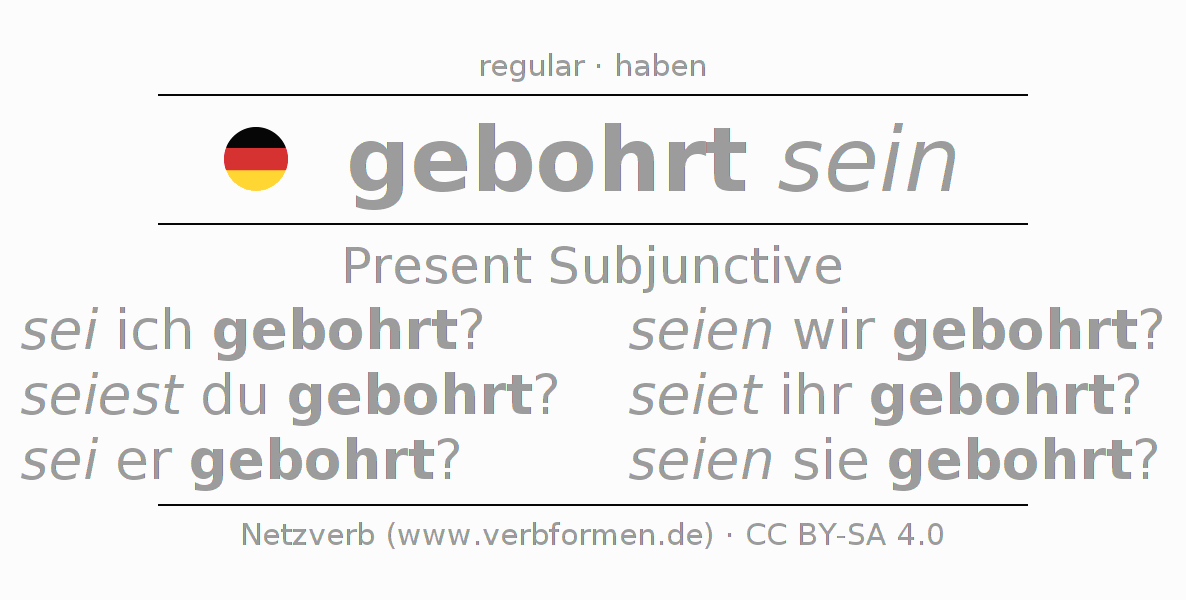 The conjugation of bohren in Subjunctive Present Form of possibility Statal Passive is sei ich gebohrt?, seiest du gebohrt?, sei er gebohrt?, seien wir gebohrt?, seiet ihr gebohrt?, seien sie gebohrt?.The conjugation corresponds to certain grammatical rules. Likewise the requirements for the conjugation of the simple verb forms of bohren in Present Subjunctive. Comments ☆
