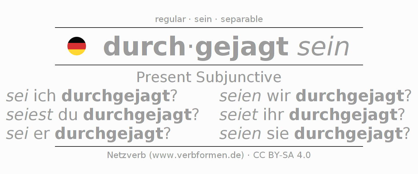 The verb durch-jagen (ist) fully conjugated in all persons and numbers in the Subjunctive Present