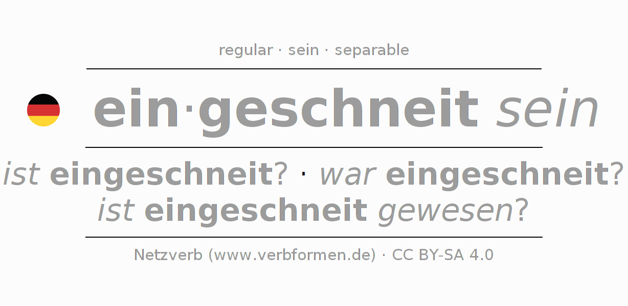 The conjugation of einschneien in Subjunctive Present Form of possibility Statal Passive is sei ich eingeschneit?, seiest du eingeschneit?, sei er eingeschneit?, seien wir eingeschneit?, seiet ihr eingeschneit?, seien sie eingeschneit?.The conjugation corresponds to certain grammatical rules. Likewise the requirements for the conjugation of the simple verb forms of einschneien in Present Subjunctive. Comments ☆