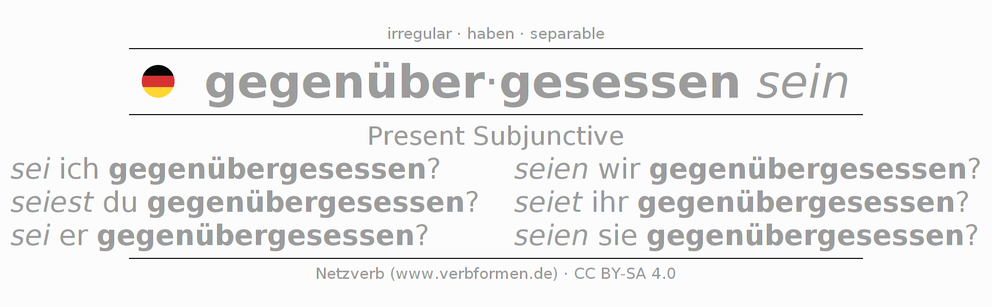 The verb gegenübersitzen (hat) fully conjugated in all persons and numbers in the Subjunctive Present