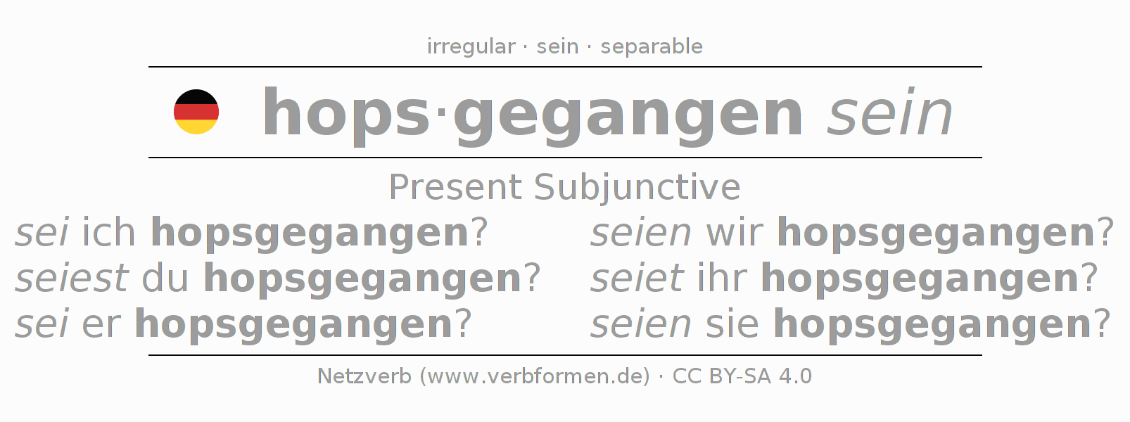 The conjugation of hopsgehen in Subjunctive Present Form of possibility Statal Passive is sei ich hopsgegangen?, seiest du hopsgegangen?, sei er hopsgegangen?, seien wir hopsgegangen?, seiet ihr hopsgegangen?, seien sie hopsgegangen?.The conjugation corresponds to certain grammatical rules. Likewise the requirements for the conjugation of the simple verb forms of hopsgehen in Present Subjunctive. Comments ☆