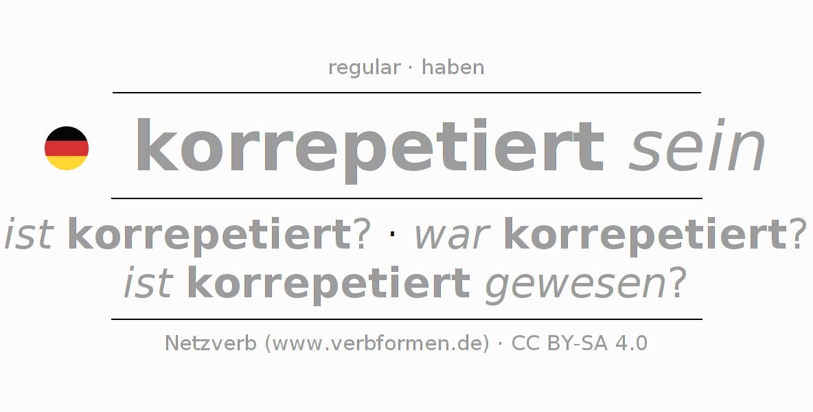 The conjugation of korrepetieren in Subjunctive Present Form of possibility Statal Passive is sei ich korrepetiert?, seiest du korrepetiert?, sei er korrepetiert?, seien wir korrepetiert?, seiet ihr korrepetiert?, seien sie korrepetiert?.The conjugation corresponds to certain grammatical rules. Likewise the requirements for the conjugation of the simple verb forms of korrepetieren in Present Subjunctive. Comments ☆