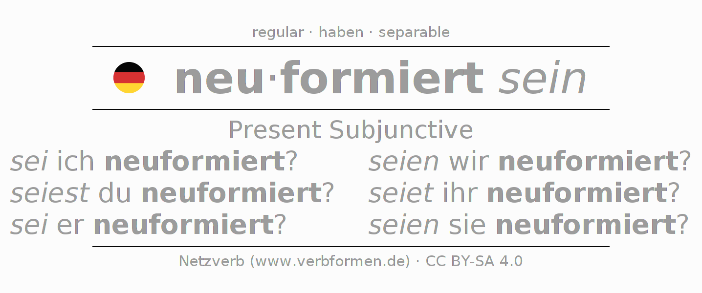 The verb neuformieren fully conjugated in all persons and numbers in the Subjunctive Present