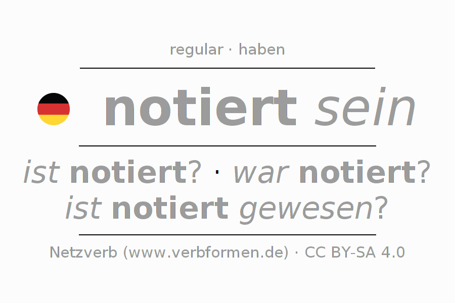 The conjugation of notieren in Subjunctive Present Form of possibility Statal Passive is sei ich notiert?, seiest du notiert?, sei er notiert?, seien wir notiert?, seiet ihr notiert?, seien sie notiert?.The conjugation corresponds to certain grammatical rules. Likewise the requirements for the conjugation of the simple verb forms of notieren in Present Subjunctive. 1Comment ☆5.0