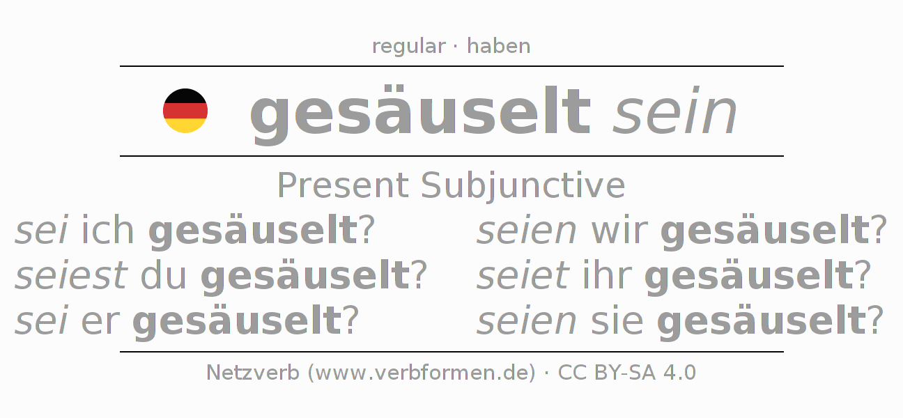 The conjugation of säuseln in Subjunctive Present Form of possibility Statal Passive is sei ich gesäuselt?, seiest du gesäuselt?, sei er gesäuselt?, seien wir gesäuselt?, seiet ihr gesäuselt?, seien sie gesäuselt?.The conjugation corresponds to certain grammatical rules. Likewise the requirements for the conjugation of the simple verb forms of säuseln in Present Subjunctive. Comments ☆