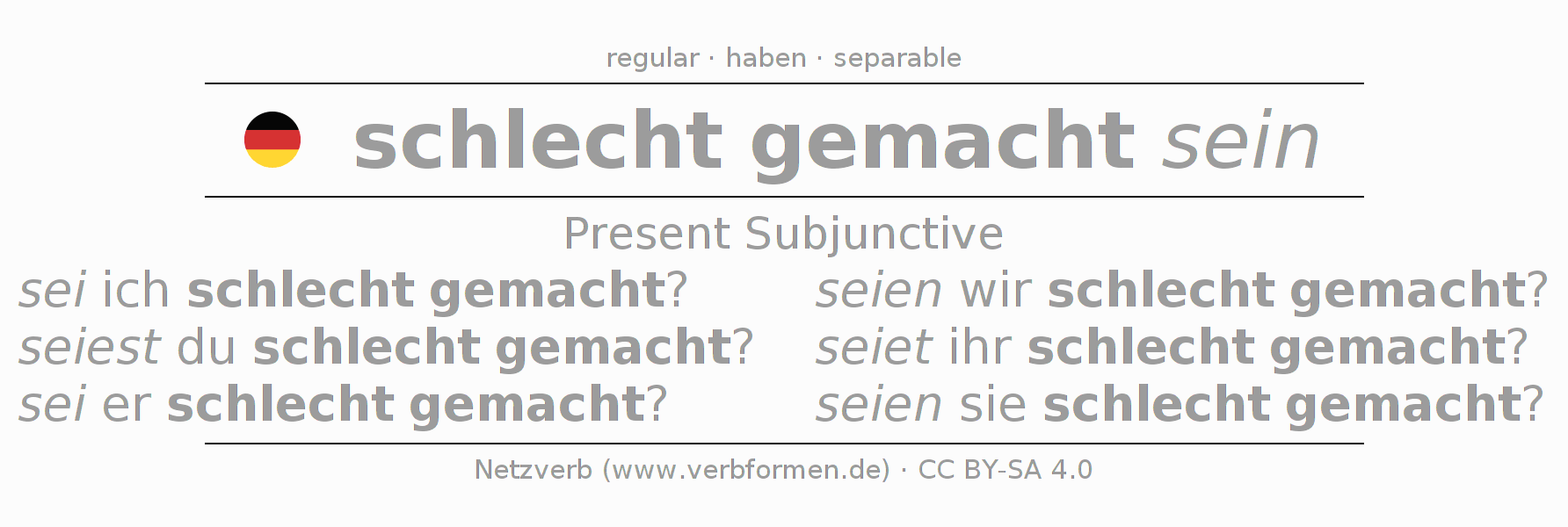 The conjugation of schlechtmachen in Subjunctive Present Form of possibility Statal Passive is sei ich schlecht gemacht?, seiest du schlecht gemacht?, sei er schlecht gemacht?, seien wir schlecht gemacht?, seiet ihr schlecht gemacht?, seien sie schlecht gemacht?.The conjugation corresponds to certain grammatical rules. Likewise the requirements for the conjugation of the simple verb forms of schlechtmachen in Present Subjunctive. Comments ☆