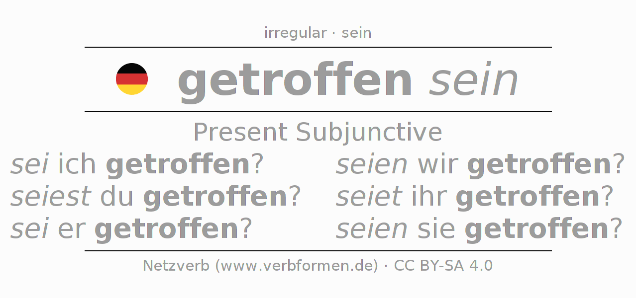 The conjugation of treffen in Subjunctive Present Form of possibility Statal Passive is sei ich getroffen?, seiest du getroffen?, sei er getroffen?, seien wir getroffen?, seiet ihr getroffen?, seien sie getroffen?.The conjugation corresponds to certain grammatical rules. Likewise the requirements for the conjugation of the simple verb forms of treffen in Present Subjunctive. Comments ☆