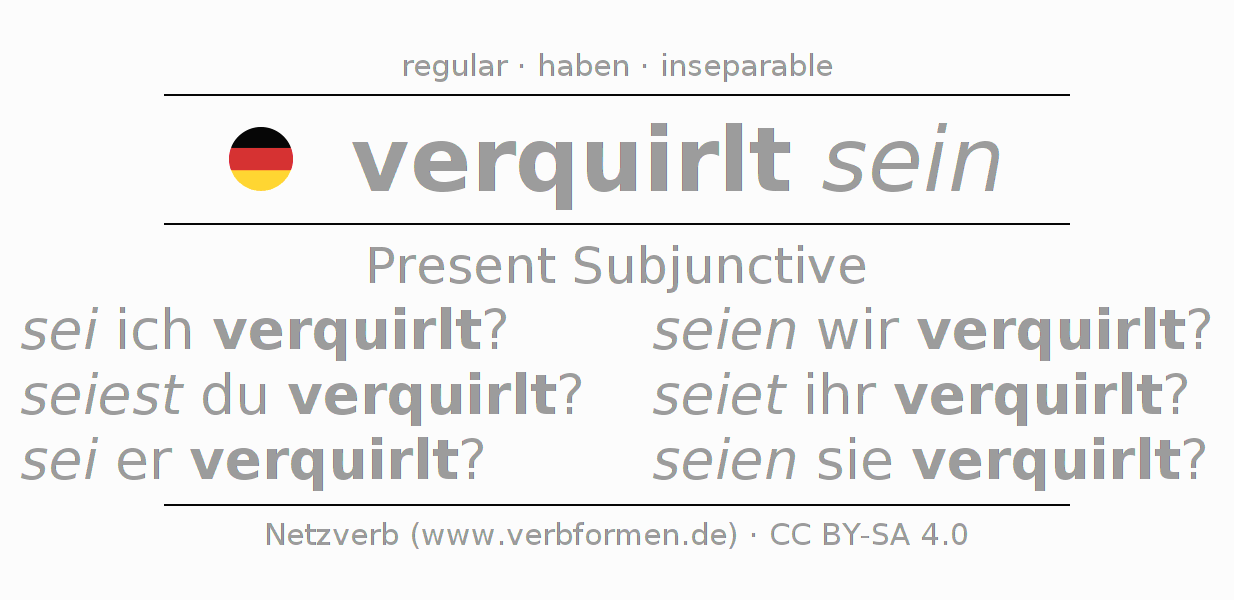 The conjugation of verquirlen in Subjunctive Present Form of possibility Statal Passive is sei ich verquirlt?, seiest du verquirlt?, sei er verquirlt?, seien wir verquirlt?, seiet ihr verquirlt?, seien sie verquirlt?.The conjugation corresponds to certain grammatical rules. Likewise the requirements for the conjugation of the simple verb forms of verquirlen in Present Subjunctive. Comments ☆