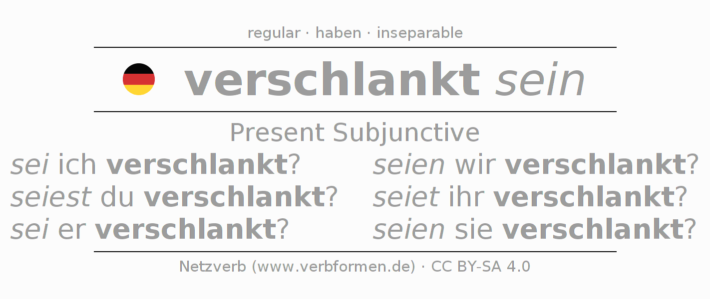 The conjugation of verschlanken in Subjunctive Present Form of possibility Statal Passive is sei ich verschlankt?, seiest du verschlankt?, sei er verschlankt?, seien wir verschlankt?, seiet ihr verschlankt?, seien sie verschlankt?.The conjugation corresponds to certain grammatical rules. Likewise the requirements for the conjugation of the simple verb forms of verschlanken in Present Subjunctive. Comments ☆