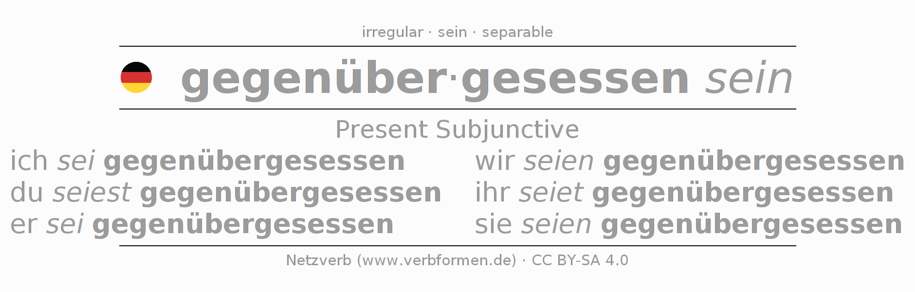 The verb gegenübersitzen (ist) fully conjugated in all persons and numbers in the Subjunctive Present
