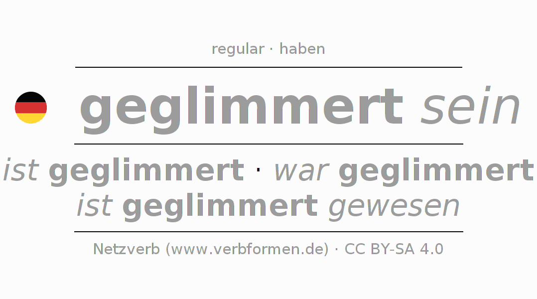 The conjugation of glimmern in Subjunctive Present Form of possibility Statal Passive is ich sei geglimmert, du seiest geglimmert, er sei geglimmert, wir seien geglimmert, ihr seiet geglimmert, sie seien geglimmert.The conjugation corresponds to certain grammatical rules. Likewise the requirements for the conjugation of the simple verb forms of glimmern in Present Subjunctive. Comments ☆