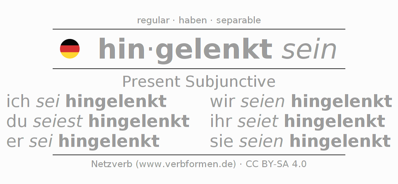 The conjugation of hinlenken in Subjunctive Present Form of possibility Statal Passive is ich sei hingelenkt, du seiest hingelenkt, er sei hingelenkt, wir seien hingelenkt, ihr seiet hingelenkt, sie seien hingelenkt.The conjugation corresponds to certain grammatical rules. Likewise the requirements for the conjugation of the simple verb forms of hinlenken in Present Subjunctive. Comments ☆