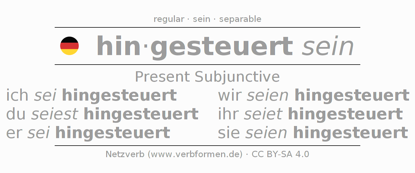 The conjugation of hinsteuern in Subjunctive Present Form of possibility Statal Passive is ich sei hingesteuert, du seiest hingesteuert, er sei hingesteuert, wir seien hingesteuert, ihr seiet hingesteuert, sie seien hingesteuert.The conjugation corresponds to certain grammatical rules. Likewise the requirements for the conjugation of the simple verb forms of hinsteuern in Present Subjunctive. Comments ☆